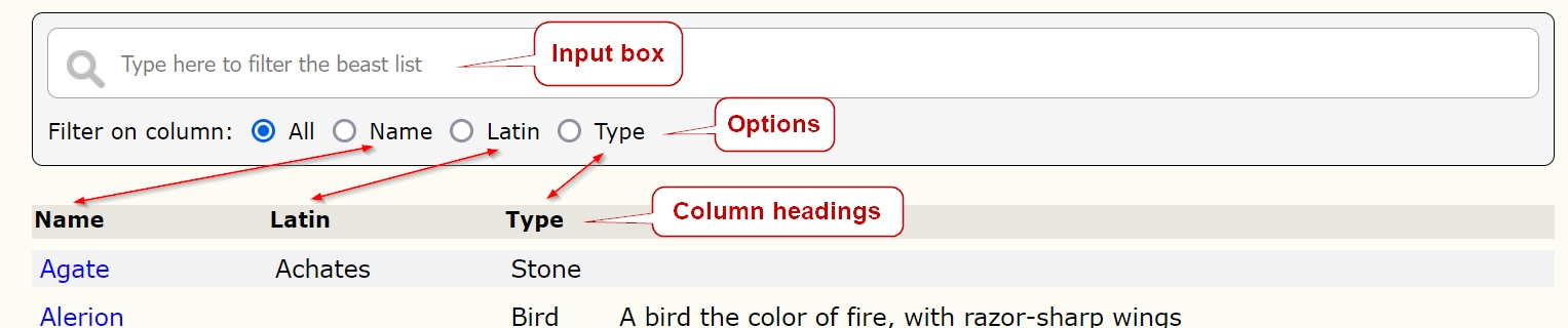The Alphabetic and Cross Refrence lists can be filtered. When you type in the box above the list (the "input box", conveniently labeled "Type here to filter the beast list"), any rows in the list that do not contain the word or partial word you type will be hidden. This is called an "incremental search": the search is redone with each letter you type to eliminate the non-matching rows and thus narrow the search. It also works in reverse: if you delete some or all of the text, more rows will appear as the search is widened.