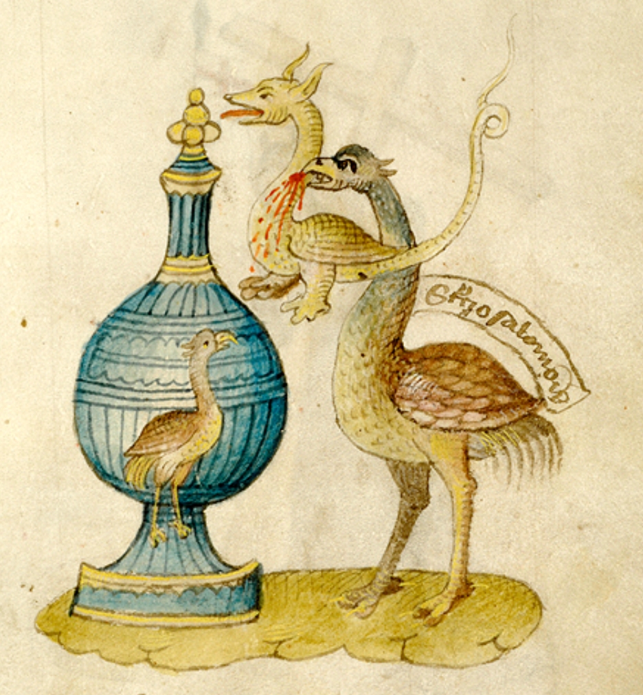 The ostrich freeing its chicks with the thamur worm is illustrated in the majority of the approximately 400 existing manuscripts of the Speculum (see the Gallery tab above). The ostrich is depicted in the usual range of camel-hoofed birds, some looking somewhat like real ostriches but many not. The artists had various ideas of what the thamur worm looked like, since it did not actually exist and was not clearly described in the Jewish or medieval texts. A few images show it as a small worm, but in others it is more like a large snake, a lizard or a dragon. One thing that is found in most illustrations shows how the worm was used to break glass; the ostrich is usually depicted applying the worm's blood to the container.