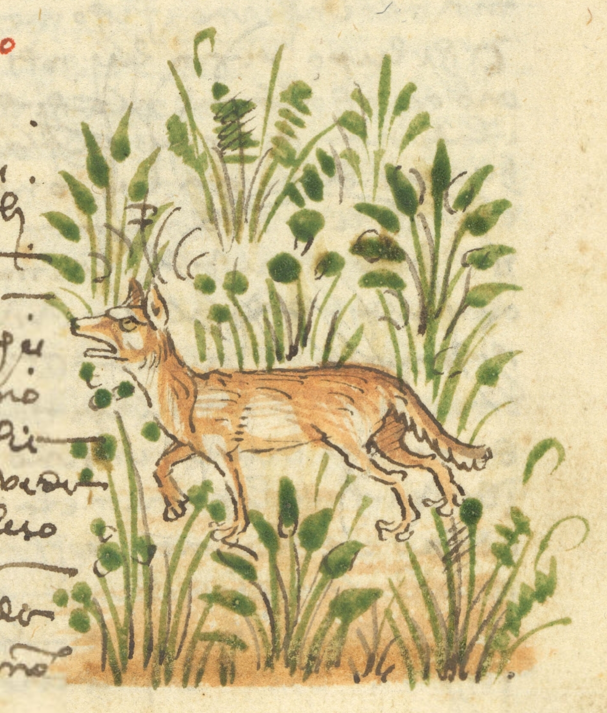 Volpe è bestia molto fraudolente et ingannevele, che infingendose si como fuosse morta, tenendo la lengua fore de la gola e nullo fiato rendendo, et allora l'uccegli che beccha carogna, credendo che sia morta, vae allei a beccharglie la lengua e tutto l'altro corpo, et ella tanto la soffere che di questi ucceli prendeno; et sì come dice fiziolaco, rende loro pegio con denti che loro non fa allei col beccho. Et naturalmente non va diritta per via, ma sempre cioppicando, però che à le gambe diritte più corte che le sinestre. Alcuna volta, quando è appresiata dai cani, leva la sua coda e li cani la prende, e remane la boccha del cani piena de pele, per la quale cagione alcuna volta scampa. Naturalmente se porta grande odio con uno animale che à nome tasso, e questo aviene per cagione de le loro tane; e per tale engegno enganna la volpe lo tasso e tolleglie la sua tana, cioè che ella glie soça la sua tana collo suo sterco e colla sua urina, la quale si è molto puççulente, e per tal modo la toglie la volpe al tasso, però che ll'abandona. Anchora usa ella grandissima malitia fugendo dai cani; cioè quando ella vede bene ch'ella non può scampare, e questo si è ultimo suo remedio, che ella se mette la coda entra le gambe et urinavi sue e tra' questa coda co l' urina e si dà sopra la testa al cane che la vole prendere, et allora el cane per la grande puçça de l' urina lassa la sua caccia e per cotale modo assai volte scampano le decte volpe.