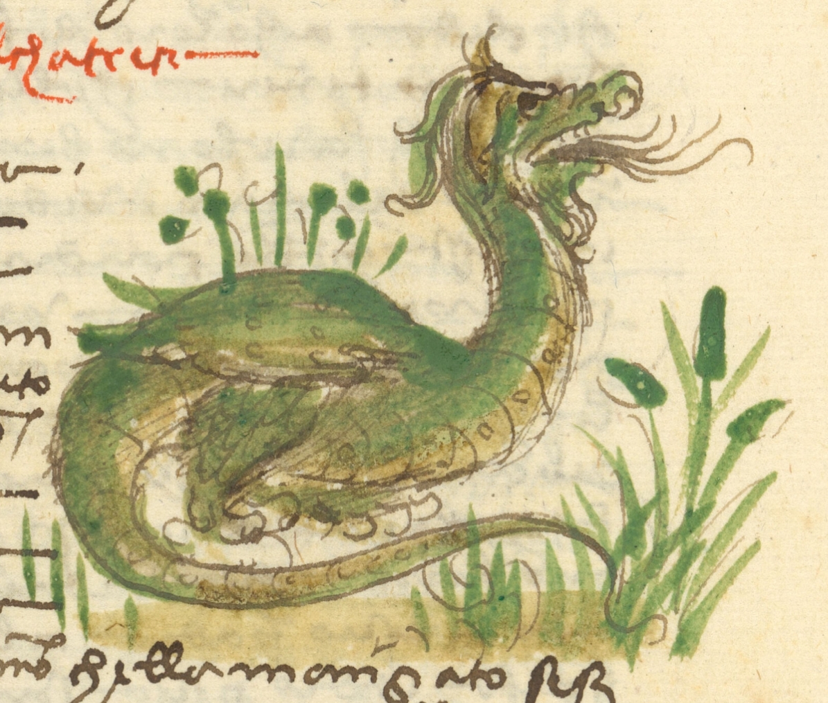 The crocodile is a very large and fat serpent, and its nature is like that of a dragon; and it has such a nature that if it finds a man, it eats him, and after having eaten him, it mourns him all its life. And there is another serpent that has many heads [hydra]; and when one is cut off, two are born from it; and this serpent finds the crocodile who is mourning the man that has been eaten, and he lies on the ground as if dead, and the crocodile comes and eats it; and when it is inside the body, it bursts its entrails and comes out of the body with great joy [hydrus]; and it takes care to do this as soon as it sees the crocodile who has eaten the man. And the crocodile also has another nature, that when it eats, it only moves its upper jaw. This crocodile who eats a man and mourns him all its life, can be compared to certain spiritual persons of this world who have within their hearts incorporated the true God and the man who was crucified to redeem the human race; for when the spiritual man remembers that such a high lord wanted to descend into the body of our lady and wanted to make all the devotions that a man should make to father and mother, and wanted to be poor and fasting, and also wanted to suffer being beaten on his neck and checks and spat in the face, and denied and tied to a column and sentenced to death and put on the cross, nailed with very great sharp points, with the pieces of his flesh and sinews being carried in front, and placed on him a crown of thorns that pierced his head down to the bones, and given to drink vinegar mixed with wine, and wounded in the side with a lance, so great compassion and great pain comes to the spiritual man within his heart. As it became with St. Francis, who had such great compassion for the things mentioned that he was likened to our Lord Jesus Christ. And when this true compassion comes into the heart of man, a noble virtue called charity is constantly present, for charity is good in many ways, and in charity the commandments of God are fulfilled, that is, to love God and one's neighbor as if he were himself, and he who loves one's neighbor loves God, for one cannot love one without the other; and he who truly has charity can be said to have all the other virtues within himself. Therefore that virtue which has many ways comes into him, and he becomes charity like the serpent that grows two heads when a man cuts one off; for when man takes away a skirt [?] from those who have charity in themselves, our Lord and Creator doubles it, having prepared forgiveness and humility; and when man gives away his person, God doubles it, having taken away from man the vile body and God will make him glorified for the patience that he has in himself; and the same thing happens with all other things that a man could injure. And just as the crocodile only moves its upper jaw when it eats, the same thing happens with good men, who only reason and think about the sovereign thoughts through which they await the glory of paradise.