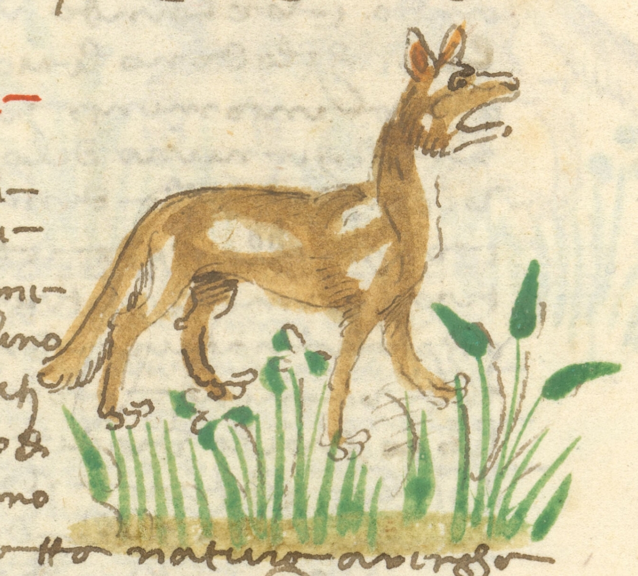 The fox is a very deceitful and deceptive beast, pretending to be dead, sticking its tongue out of its mouth and not breathing. Then birds begin pecking at this carrion, believing it to be dead, and go after it and peck at its tongue and all its other parts, and it suffers so much that the fox takes these birds; and, as the poet says, it does more harm with its teeth than they do with their beaks. And by nature it does not walk straight along the road, but always staggers, because its right legs are shorter than its left. Sometimes, when approached by dogs, the fox raises its tail and the dogs catch it, leaving the dogs' mouths full of fur, which is why it sometimes escapes. By nature the fox bears great hatred for an animal called the badger, and this happens because of their dens; and by this ingenuity the fox deceives the badger and takes away its den, that is, the fox pollutes its den with her dung and urine, which is very smelly, and in this way the fox takes it away from the badger, because the badger abandons it. She also uses great cunning in fleeing from dogs; that is, when she clearly sees that she cannot escape, and this is her last resort, she puts her tail between her legs and urinates there, and with the tail and the urine, she attacks the dog who wants to catch her. Then the dog, because of the great stench of the urine, gives up his chase, and in this way the foxes often escape.