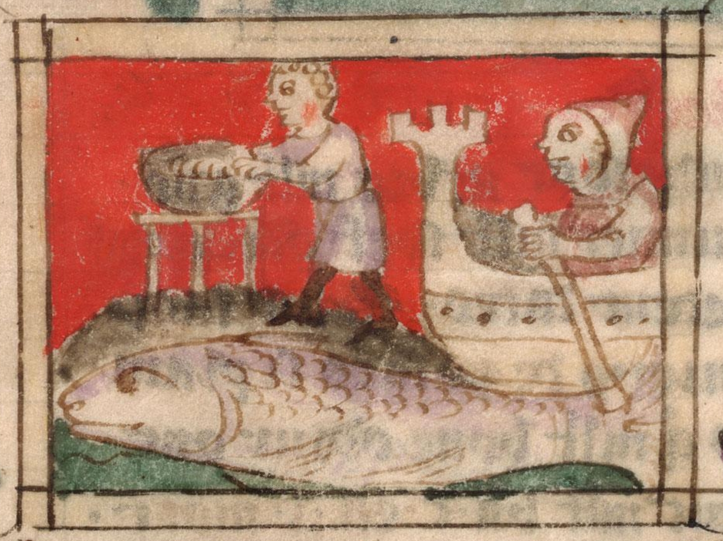 Si ra en la mer ·i· poison si grant et si merveilleus qu’il croist desus son dos terre et herbe, et samble que ce soit une grant ille. Dont la gent qui vont par mer sont aucunes foiz deceüz; car il cuident que ce soit terre. Si s’atraient cele part. Et quant il ont fait leur atrait de feu et de loges et de ce que mestiers leur est, comme cil qui cuident estre a terre, si alument lor feu et font leur cuisine. Mais quant li poissons sent le feu, si s’esmuet si soudainement et se fiert en parfont en l’yaue, si qu’il afonde tout, quanque il a sus lui. Et ainsi sont les nés paries et les genz noiez qui cuidoient estre a sauveté.